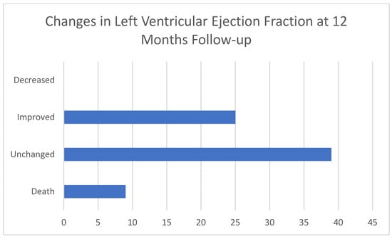 Changes in left ventricular ejection fraction at 6-month follow-up (n = 64).