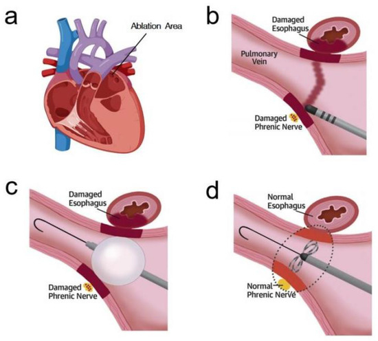 The pathogenesis of AF is complex and the quality of life of patients with AF is significantly reduced. European guidelines recommend catheter ablation for patients with medically refractory and heart failure symptoms. It has been shown that pulmonary vein lesions play an important role in arrhythmia and heart rate persistence like AF, making pulmonary vein isolation the cornerstone of catheter ablation [5,12,13,14]. In clinical practice, CBA and RFA are the more commonly used catheter ablation techniques, and clinical studies have shown that RFA produces injury by resistive heating of the tissue and subsequent conduction of heat to deeper tissues. Although the ablation is very effective, it ablates the target area while causing unnecessary damage to other important tissues, such as esophageal damage due to the heat during RFA [15,16,17]. CBA is another widely used ablation modality that is very different from RFA. It ablates the target area by removing heat, resulting in tissue cooling and icing. However, as with RFA, CBA can have several associated complications, and this technique may increase the risk of damage to surrounding tissue structures and increase the incidence of complications such as pulmonary vein stenosis, phrenic nerve injury, and peri-esophageal vagal nerve injury [18,19,20,21,22].