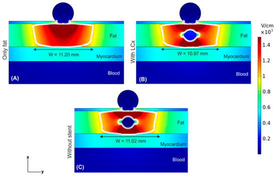 Schematic diagram of epicardial ablation [41]. (A) Without coronary artery fat layer. (B) With coronary artery fat layer. (C) With arterial stent fat layer.
