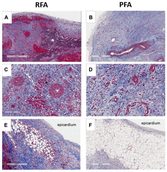 To further investigate the safety of the PFA technique, Stewart et al. [46] used a circular pulmonary vein catheter ablation experiment on six pigs using both the RFA technique and the PFA technique. Necropsy verification of the animals using the different techniques after two weeks demonstrated that the use of the PFA technique produced consistent transmural and tissue fibrosis, whereas the use of the RFA technique produced a more severe inflammatory response and some damage to epicardial fat as well as arterioles, proving that the PFA technique can cause fibrotic lesions in tissues without damage to non-target tissues. The ablation effects of RFA and PFA are shown in Figure 3. Koruth et al. [47] observed the electrocardiographic changes in four pigs before and after ablation, and the hearts were dissected and observed after the euthanasia of the animals. No arrhythmia occurred during the ablation process, and the dissected hearts were found to have an average depth and extent of lesions and uniform tissue fibrosis without damage to other tissues.