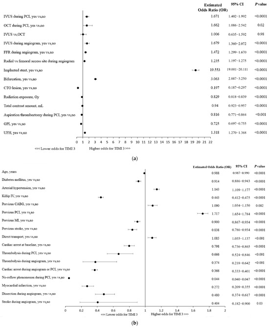 The use of any of the intravascular imaging modalities, IVUS (OR, 1.67; 95% CI: 1.40–1.99; p < 0.0001) or OCT (OR, 1.66; 95% CI: 1.09–2.54; p = 0.02), for the guidance of RA-PCI was independently associated with the technical success of the procedure, defined as TIMI 3 flow following the PCI (Figure 1a). No significant superiority of one technique over the other was found in a multivariable analysis. Importantly, the use of adjunctive IVUS during coronary angiography increased the chances of a successful RA-PCI by nearly 68% (Figure 1a). Considering other procedural indices, the radial access site, stent implantation, and fractional flow reserve (FFR) assessment during the angiogram were shown to be associated with technical success. Given the coronary lesion characteristics, bifurcation PCI was linked to higher odds for successful revascularization, whereas CTO (chronic total occlusion) lesions were found to be associated with a lower chance of achieving postprocedural TIMI 3 flow (Figure 1a). Furthermore, aspiration thrombectomy performed during the procedure as well as a higher usage of contrast dye and greater radiation exposure were associated with reduced odds for technical success (Figure 1a).