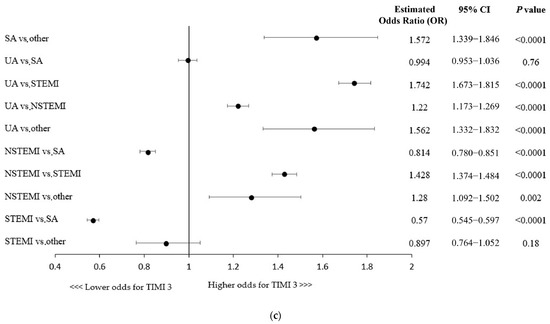 (a) Factors associated with thrombolysis in myocardial infarction (TIMI) 3 flow: multivariable analysis. CTO, chronic total occlusion; FFR, fractional flow reserve; GPI, glycoprotein IIb/IIIa inhibitors; IVUS, intravascular ultrasound; OCT, optical coherence tomography; PCI, percutaneous coronary intervention. (b) CABG, coronary artery bypass grafting; MI, myocardial infarction; PCI, percutaneous coronary intervention. (c) Factors associated with thrombolysis in myocardial infarction (TIMI) 3 flow with regard to patient clinical presentation: multivariable analysis. NSTEMI, non-ST-segment elevation myocardial infarction; SA, stable angina; STEMI, ST-segment elevation myocardial infarction; UA, unstable angina.