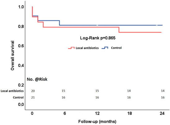 The endpoints are summarized in Table 5. Thirty-day mortality was 12% overall, 15% in the local antibiotics group, and 10% in the control group (p = 0.66). The causes of early mortality were septic multiorgan failure in three cases and cardiac failure in two cases. Two-year mortality increased to 27% overall, 30% in the local antibiotics group, and 24% in the control group (Figure 2). Recurrent infective endocarditis occurred in one patient in the local antibiotics group and in one patient in the control group (p > 0.99). Both patients underwent reoperation. The time interval between the index operation and the recurrence of infective endocarditis in the local antibiotics group was 19 months and 40 days in the control group.