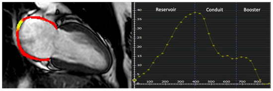 After that, with an automatic computation, the software algorithm automatically tracked the myocardial borders throughout the cardiac cycle. The quality of the tracking and contouring was visually validated and manually corrected when needed. There are three peaks in the strain curve, including reservoir, conduit, and booster strain, as shown in Figure 2.