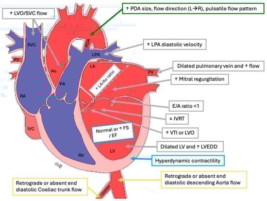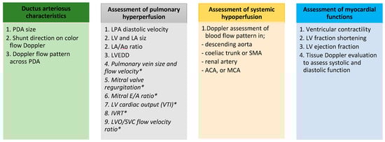 Summary of the echocardiographic assessment of PDA and its hemodynamic impacts. The parameters labeled with * are less commonly used for echocardiographic assessment. ACA—anterior cerebral artery, Ao—aorta, Coeliac—coeliac trunk, E/A—early diastolic flow velocity (E velocity) vs. late diastolic transmitral flow velocity (A velocity), IVC—inferior vena cava, IVRT—isovolumic relaxation time, MCA—posterior cerebral artery, L→R, left-to-right shunt, LA—left atrium, LPA—left pulmonary artery, LV—left ventricle, LVEDD—left ventricular end-diastolic diameter, pulmonary artery LVO—left ventricular cardiac output, PA—pulmonary artery, PDA—patent ductus arteriosus, PV—pulmonary vein, RA—right atrium, RV—right ventricle SMA—superior mesenteric artery, SVC—superior vena cava, VTI—velocity time integral.