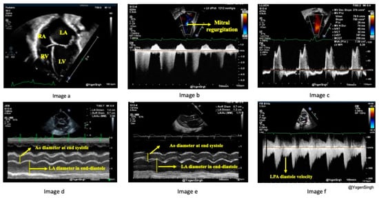 Echocardiography assessment of pulmonary over-circulation. (a) shows the left heart is larger than the right heart due to volume overload in the apical four-chamber view. (b) shows the mitral regurgitation on color flow mapping from the apical four-chamber view. (c) shows E/A ratio inversion across the mitral valve inflow. (d) shows the increased LA to Aorta (LA/Ao) ratio in the parasternal short-axis view on the M-mode. (e) shows the increased LA to Aorta (LA/Ao) ratio on the M-mode in the parasternal long-axis view. (f) shows an increased diastolic velocity in the left pulmonary artery (LPA). LA—left atrium, LV—left ventricle, RA—right atrium, RV—right ventricle, Ao—aortic valve, LPA—left pulmonary artery.