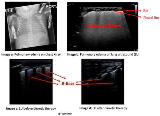 Assessment of pulmonary edema on chest X-ray and lung ultrasound (LU). (a) shows pulmonary edema with increased opacity on the chest X-ray. (b) shows severe pulmonary edema with a white-out appearance on LU. The white-out appearance results from coalescent B-lines, which are echogenic vertical lines below the pleural line, indicating interstitial pulmonary fluid. (c) shows severe pulmonary edema with multiple B-lines before the diuretic therapy. (d) shows fewer B-lines, suggesting decreased pulmonary edema after the diuretic therapy. LU—lung ultrasound.
