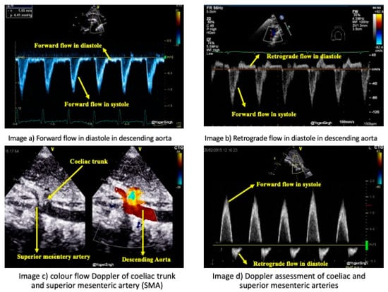 Doppler assessment of blood flow in the descending aorta post-ductally, in the coeliac trunk, and the superior mesenteric artery. (a) shows forward blood flow during systole and diastole in the descending aorta from the suprasternal arch view. (b) shows retrograde blood flow during diastole in the descending aorta, indicating ‘ductal steal’ in the presence of an hsPDA. (c) shows the coeliac and superior mesenteric arteries from the subcostal longitudinal color compare view, and (d) shows retrograde blood flow during diastole in the coeliac and superior mesenteric arteries, indicating ‘ductal steal’ similar to flow in the descending aorta.