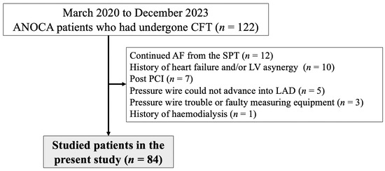 This retrospective study included 122 patients with chest pain who underwent coronary angiography (CAG) and CFT between March 2020 and December 2023. Patients with moderate coronary stenosis (% stenosis ≥ 50%), moderate chronic kidney disease (CKD) with an estimated glomerular filtration rate (eGFR) of <45 mL/min/1.73 m2, or with a history of heart failure or percutaneous coronary intervention (PCI) were excluded, as were patients with several risk factors (Figure 1). Finally, 84 patients who were diagnosed with ANOCA were included. The ethics committee of the JR Hiroshima Hospital approved this study (2023-52). Informed consent was obtained from all the included patients.