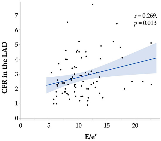 Relationship between the E/e′ and the CFR in the LAD. The straight line is the regression line and the confidence interval is shown in blue. CFR, coronary flow reserve; LAD, left anterior descending coronary artery.