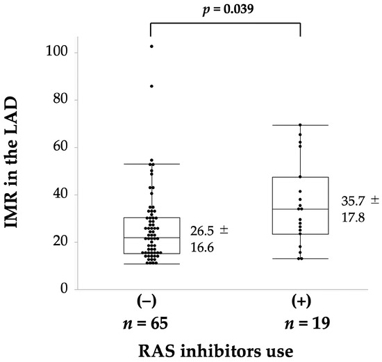 Regarding the factors influencing the IMR, body mass index (r = 0.284, p = 0.009), smoking history (IMR: 44.2 ± 22.3 in 12 smokers, 26.0 ± 14.9 in 72 non-smokers, p < 0.001), HDL cholesterol level (r = −0.219, p = 0.046) and RAS inhibitor use (IMR: 35.7 ± 17.8 in 19 patients on RAS inhibitors, 26.5 ± 16.6 in 65 patients not on RAS inhibitors, p = 0.039, Figure 3) were significant factors. Logistic regression analysis showed that RAS inhibitor use (p = 0.018) and smoking status (p = 0.041) were significantly associated with an increased IMR (≥25, Table 2C). Regarding the use of RAS inhibitors among the 19 patients included in this study, angiotensin-converting enzyme inhibitors and angiotensin II receptor blockers were used by 1 and 18 patients, respectively.