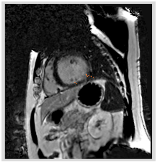 Cardiac MRI short-axis view of the left ventricle in a patient with AMVPS demonstrating areas of late gadolinium enhancement (LGE) affecting the posterolateral left ventricle and papillary muscle (arrows).