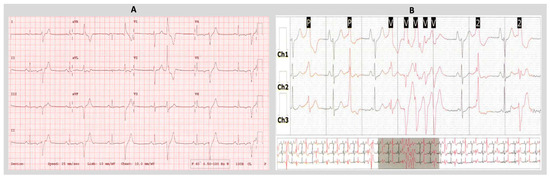 There is a limited amount of data examining the role of catheter ablation (CA) in the treatment of VAs in patients with isolated MVP. Sudden ventricular fibrillation triggered by complex ventricular ectopy is considered to be the predominant mechanism of SCD in patients with AMVP syndrome (Figure 3) [21]. Thus, identification and elimination of the triggering PVC focus is an important treatment strategy with a reported long-term success rate of 60 to 84% [38,39,40]. Catheter ablation is also used in patients with MVP and symptomatic VAs refractory to medical treatment, recurrent appropriate ICD therapies, and PVC-mediated cardiomyopathy [21,37,39,41].