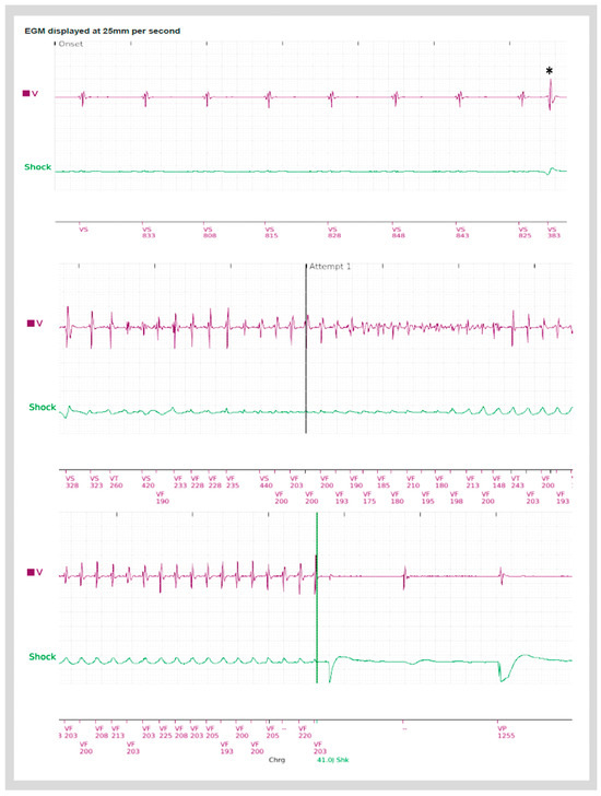 Electrograms from an implantable cardioverter defibrillator (ICD) in a patient with AMVPS demonstrating an episode of ventricular fibrillation, preceded by a premature ventricular complex (*), which was successfully terminated by one ICD shock.