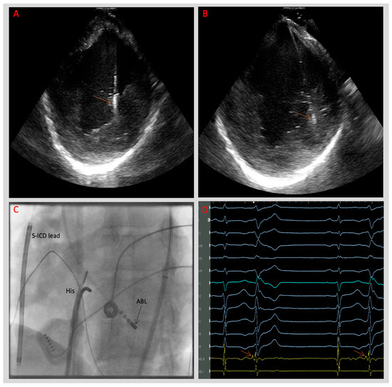 (A,B) Intracardiac echocardiography (ICE) views of the left ventricle demonstrating ablation catheter contact (arrows) with posteromedial papillary muscle (PM) during radiofrequency (RF) energy delivery in a patient with AMVPS. (C) Fluoroscopy in the same patient demonstrating an ablation catheter tip (black arrow, ABL) at the PM level. (D) Electrogram demonstrating the site of successful ablation in a patient with AMVPS with frequent PVCs originating from posteromedial papillary muscle (RBBB morphology with superior axis) preceded by Purkinje potentials (arrows on the ablation catheter [ABL] channel). (His: Hexapolar catheter at the His bundle level, S-ICD: subcutaneous implantable cardioverter defibrillator).
