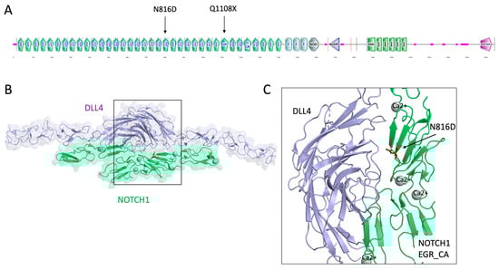 Structure of NOTCH1 EGF CA domain. (A) Domain organization of the human Notch1 protein sequence performed using the Uniprot database. Variants p.Asn816Asp and p.Gln1108Ter, are mapped to the protein structure. (B) Three-dimensional structure of EGF modules of the NOTCH extracellular domain bound to DLL4 []. (C) Interface region between Notch1 and DLL4 proteins. EGR domain is colored with green, DLL4 is colored with blue. Calcium ions are represented as gray spheres. Mutated residue in 816 position is marked in red color.