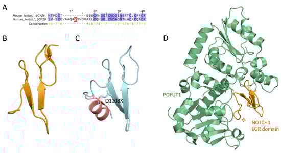 The Notch1 EGR-like domain. (A). A local alignment of a mouse Notch1 EGF26 (PDB ID: 5ky4 chain B). with a human Notch1 EGF29. Conservation score is visualized under the alignment for each column. Residues matching the consensus sequence residue at a given position are colored dark blue, while those that do not match the consensus residue, but have a positive BLOSUM62 score [], are colored light blue. Positions with conservation score equal to 10 are marked as ‘+’. Positions with all identical residues are marked as ‘asterisk’. Yellow arrows indicate β-strands, red barrel indicates α-helix (B) A crystal structure of mouse Notch1 EGR-domain (PDB ID: 5ky4). (C) Alphafold2 model of a human Notch1 EGR-domain. (D). Mouse POFUT1 (green) in complex with mouse Notch1 EGF26 (orange) []. Orange letter ‘N’ means N-terminal part of an EGR-like domain.