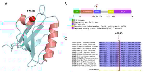 A human DVL3 protein. (A) X-ray structure of the PDZ domain of DVL3 (PDB ID: 6zbq). Mutated residue in 286 position is marked as a sphere in red color. (B) Domain organization of the human DVL3 protein sequence performed using the Uniprot database. Variant p.Ala286Asp is mapped to the protein structure. (C) A local alignment of a human PDZ domain with orthologues. Conservation score is visualized as in Figure 2A.