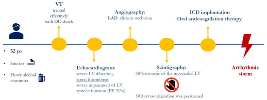 The clinical case focuses on a 52-year-old male smoker and heavy alcohol consumer with a family history of ischemic heart disease. His cardiological history began in 2017 when he went to the emergency room due to epigastric pain. Sustained VT was diagnosed and treated effectively with DC shocks. The ECG with the sinus rhythm showed q waves in the anterior–lateral leads, which corresponded with necrosis (Figure 1).