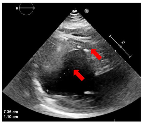 Echocardiographic image (parasternal long axis) showing a severely dilated left ventricle with apical thrombosis (red arrows).