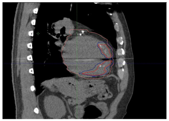 Thanks to cooperative work with radiation oncologists and medical physicists, a personalized treatment plan was created to deliver an effective high dose of radiation to the target areas, minimizing exposure to nearby organs at risk [12]. The clinical target volume (CTV) was identified in accordance with radiation oncology and cardiology, considering the scar area based on anatomical CT imaging. Based on the 4D-CT acquisition, an internal target volume (ITV) was added to CTVs in order to compensate for respiratory motion. Finally, the planning target volume (PTV) was defined by adding 0–2 mm to the ITV (Figure 6).