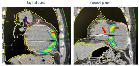 Dose distribution and treatment plan shown in sagittal CT images (left) and coronal plan (right). The areas outlined by the yellow, violet and red lines correspond to the organs at risk (OARs). The area outlined by the pink area corresponds to the heart volume. Colored areas correspond to isodose level of RTplan. Notice that the ICD lead was excluded from treatment (red arrow).