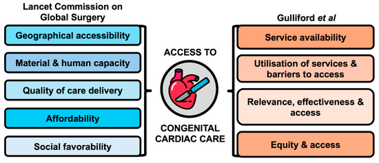A key component of studying access to care is defining the concept of access. Despite its semantic focus on physical access, true access is a function of individual but indispensable components. The Lancet Commission on Global Surgery described access to care as ensuring geographical accessibility, resource (including workforce) availability, care quality, and financial affordability [21]. This may be extended to include a fifth pillar, being the social acceptability of care within a community [22]. Access to care can further be approached through the framework by Gulliford et al. [23], focusing on service availability, service utilization, relevance and effectiveness, and equity. For the purposes of this review, both frameworks are merged to holistically study access to CHD care (Figure 1).