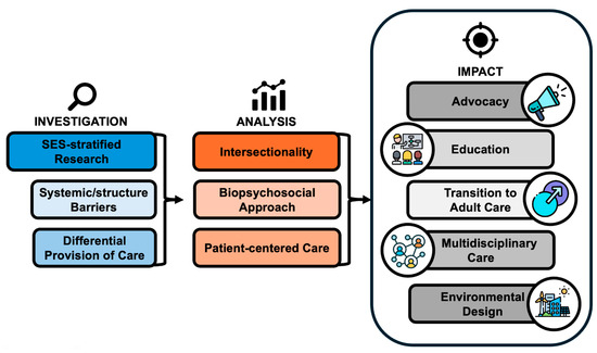 Stratified analysis can provide a starting point for understanding complex problems with many moving parts, such as the impact of SES on CHD/ACHD management (Figure 3). SES subgroup analysis for health outcomes research and distributional cost-effectiveness analyses can identify systemic barriers and inform policy change. Furthermore, understanding trends in referrals, surgical techniques, and postoperative follow-up can help identify areas of clinical equipoise and advise guideline development. Once issues on the system levels are characterized, it is important to redirect the focus back to the patient and apply shared decision-making when constructing treatment plans. Furthermore, proper patient-centered care requires an intersectionality lens that takes into consideration the totality of the patient identities, experiences, and traditions to proactively evaluate the challenges patients might encounter while navigating the healthcare system [35]. This includes taking measures to ensure that the vulnerable period in transitioning from pediatric to adult cardiac care is seamless and retains access to specialty services. CHD in childhood can directly impact a patient’s future wellbeing through the need for reintervention or indirectly through developmental delays due to a protracted hospital stay during a patient’s formative years. The more elusive biopsychosocial sequelae of pediatric CHD affect not just the patients but also their families, and caregiver burden should not be overlooked [53]. The numerous stakeholders and multisystem involvement of this special patient group calls for an interdisciplinary approach to care that encompasses non-cardiovascular health services for mental health, neurodevelopmental, and social work needs [37,38]. Widening this purview even further, the environments that support patients after discharge from hospital underpin and sustain their health status. Urban planning of green spaces and government programs for health-promoting behaviors (e.g., subsidies for gym memberships, digital health technologies, hospital transportation, health literacy campaigns) are ways to improve a population’s collective health. There is no singular solution to optimizing the socioeconomic health of patients with CHD/ACHD, but concerted and diversified efforts in multiple spheres can make a difference that is greater than the sum of its parts.