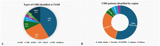 Distribution of Congenital Heart Diseases (CHD) at Tikur Anbessa Specialized Hospital (TASH). (A) shows types of CHDs identified at TASH. (B) shows CHD patients identified by region.