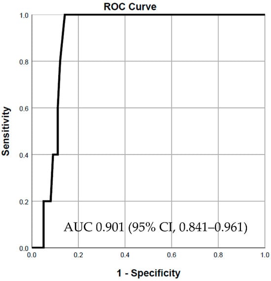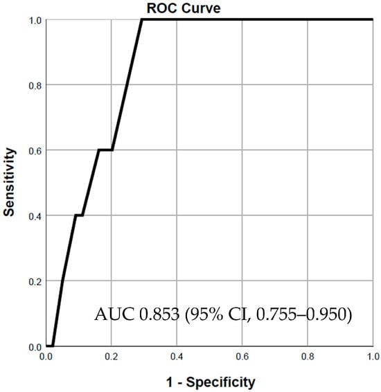 Both selected variables were successively incorporated into a logistic regression model to predict in-hospital mortality. Firstly, the SD2/SD1 ratio demonstrated good predictive power, with an area under the curve (AUC) of 0.853 (95% CI, 0.755–0.950, p = 0.008) (Figure 1). Adding approximate entropy to the model increased the predictive power, resulting in an AUC of 0.901 (95% CI, 0.841–0.961, p = 0.003) (Figure 2). However, including LVEF in the final model to assess its impact on predictive power did not lead to a statistically significant change (chi-square test, p = 0.234). Notably, for patients with severe systolic dysfunction (LVEF ≤ 30%), the predictive power of the combined model using the SD2/SD1 ratio and approximate entropy remained strong, with an AUC of 0.816 (95% CI, 0.641–0.990) (Supplementary Figure S4).