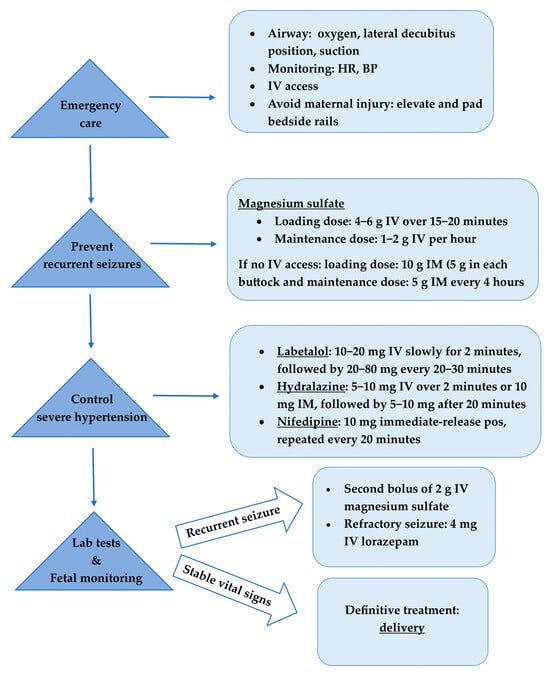 The management of eclampsia uses a team-based approach that involves obstetricians, anesthesiologists, labor and delivery nurses. Eclamptic women should only be cared for in hospitals with adequate medical ICUs and transported by ambulance with medical personnel present for proper management in case of subsequent convulsions []. Actions to manage eclampsia include emergency care during the seizure to ensure the health and safety of both mother and fetus, medication to stop eclampsia seizures and their recurrence, and antihypertensive drugs to control hypertensive crises []. The definitive treatment of eclampsia is delivery of the fetus as soon as the woman is stabilized [,,]. Therefore, eclamptic women require immediate obstetric consultation and admission to an equipped labor and delivery unit. If there is a risk of premature birth or fetal disturbance, the advice of a pediatrician or neonatologist is also necessary []. While the management of eclampsia varies in different regions, the therapeutic approach to eclampsia in most parts of the world typically follows the algorithm presented in Figure 1.