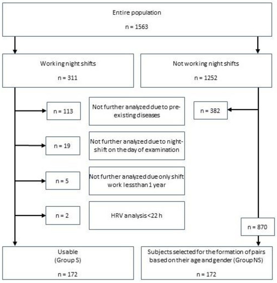 Based on 24 h HRV analyses in various preventive medicine studies carried out on subjects currently in work and either doing night shift work (n = 311) or not doing night shift work (n = 1252), male and female study participants aged between 18 and 65 were included in the analysis. Of the 311 subjects who worked shifts with night work (Group S) and had been carrying out this activity for at least one year, 172 could be included in the study (128 male, 44 female). Subjects who suffered from specific pre-existing diseases or to whom circumstances that are known to influence HRV applied were excluded (n = 113). The pre-existing diseases leading to the exclusion were identified by means of a questionnaire and included diabetes mellitus, coronary heart disease, history of cardiac infarction, history of coronary artery stent placement, hypertension, other heart diseases, history of cerebrovascular accident, psychiatric medication, thyroid diseases, Parkinson’s disease, epilepsy, chronic obstructive pulmonary disease, chronic renal insufficiency, regular headaches, and pregnancy. Subjects with a HRV analysis less than 22 h (n = 2), subjects who had worked night shifts for less than one year (n = 5), and subjects who had worked night shifts on the day of examination (n = 19) were also excluded. The included participants worked as police officers (n = 49), in the rescue system (n = 36), as soldiers (n = 30), as employees in the communal transport services (n = 17), and as other professionals (n = 40) and had different forms of night shift duty. After the exclusion criteria had been applied, the subjects of this night shift worker group were compared with subjects from the non-night shift worker group (Group NS) at a ratio of 1:1, forming matched pairs based on the subjects’ sex and age. Subjects with an age difference of ±1.5 years were considered to be of the same age. Care was taken that the subjects of the non-night shift worker group did not have any of the above-mentioned pre-existing diseases either. Figure 1 shows an overview of the methodological approach.