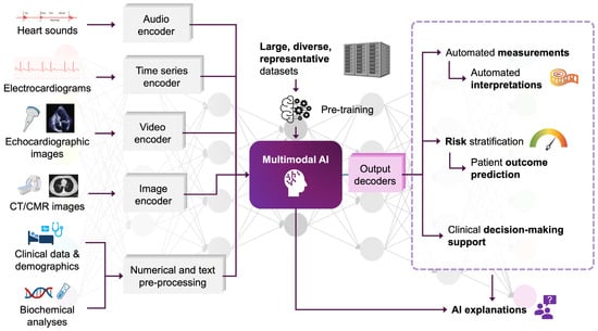 Moreover, few AI studies address the lack of explainability, particularly in the context of DL and radiomics. Future research should focus on AI explainability, as increased explainability can mitigate the ‘black box effect’ that is present in AI models and allow for greater autonomy for clinicians when using the model in clinical practice [62,97,101,102]. A growing body of work provides a foundation for continued development of ‘explainable AI’, with Shapley Additive Explanation analysis and other interpretative techniques already being used [86,90]. This is especially relevant given that AI and ML models are becoming increasingly ‘multimodal’, which describes the capacity of AI models to consider and analyse multiple data input modalities simultaneously [103]. Multimodal AI models are promising in providing improved performance and workflow integration by leveraging multiple forms of data, rather than focusing on a single imaging or data modality alone [67]. This capability extends to data modalities outside the scope of this review, including heart sounds and electrocardiograms [62,67]. Figure 3 accordingly demonstrates a multimodal framework that may be developed in the future to leverage AI to its fullest. In the same manner that research transitioned from single predictors to prediction scores many years ago, the research landscape is likely to transition once more from single modality AI models to multimodal AI models to provide evidence-based, personalised patient care.