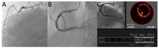 OCT is a high-resolution intravascular imaging modality which uses near-infrared light to produce cross-sectional images of the coronary artery. Thanks to its high resolution (10–20 μm), OCT enables a detailed assessment of arterial wall and plaque morphology [12,13], as well as the optimization of stent deployment [8]. Although the evidence in the context of CTO-PCI is limited in respect to the other coronary imaging modalities, OCT has several applications. During CTO-PCI, the guidewire crossing of the lesions is a major challenge. OCT can help to confirm the intraluminal position of the guidewire, thereby decreasing the risk of subintimal course and potential perforation or dissection [14]. Moreover, in extra-plaque techniques used to cross the CTO lesion, case reports showed the feasibility of an antegrade dissection-and re-entry (ADR) approach through a novel OCT-guided CTO re-entry device, which provides real-time image guidance for true lumen re-entry [15]. After successful guidewire crossing, OCT can help to analyze the CTO-plaque, assessing its composition (fibrous, calcific, lipid-rich). In some CTOs, thanks to its high-resolution, OCT can identify microchannels within the context of the plaque, which sometimes may facilitate the progression of soft, low-profile guidewires [16]. Finally, OCT favors stent deployment and optimization (Figure 1A–C), which resulted in a significantly lower risk of target vessel failure (TVF) in a prespecified sub-study of the RENOVATE-COMPLEX-PCI trial [17]. However, despite its applications, OCT presents several limitations in CTO-PCI. First, its limited penetration depth (1–2 mm) could be a drawback in cases with large or heavily calcified plaques where a deeper visualization is required. Second, OCT imaging requires the clearance of blood from the vessel, typically achieved through contrast injection. This requirement can increase the risk of extending a dissection rim when it has been caused by guidewire crossing. Further studies will provide further data about OCT use in CTO-PCI.