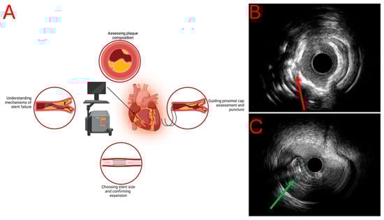 IVUS is an imaging modality that uses high-frequency sound waves to create detailed cross-sectional images of the coronary arteries. IVUS catheters are equipped with ultrasound transducers that emit sound waves, which reflect off the vessel wall and the surrounding structures, and the reflected signals are then converted into images that provide the real-time visualization of the vessel lumen and wall [18,19]. IVUS catheters can be either phased array or mechanical. Phased array catheters present multiple transducers that electronically steer the ultrasound beam, while mechanical catheters have a single rotating transducer [20]. Thanks to its high penetration, IVUS has several applications in CTO-PCI (Figure 2A,B).