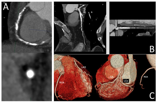 (A) visualization of a high-calcified CTO plaque of a right coronary artery with the slab maximum intensity projection (MIP) technique; (B) curved and stretched multi-planar reconstruction of a LAD-CTO; (C) three-dimensional reconstruction of coronary arteries through the volume rendering approach.
