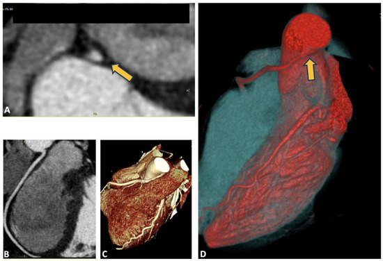 Anomaly of the right coronary artery from the left Valsalva sinus. In panel (A), the origin of the coronary artery is visible, showing an oval-shaped ostium, as indicated by the yellow arrow; panels (B,C) display the course of the vessel after its emergence from the left sinus; in panel (D), high take-off is observed, as indicated by the yellow arrow.
