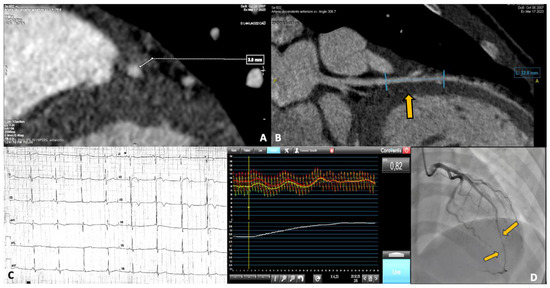 In panels (A,B), the CCTA images show the malignant features of the myocardial bridge, with a length > 25 mm and a depth > 2 mm. In panel (C), the anterolateral repolarization abnormalities present at baseline, before correction, are displayed. In panel (D), the coronary angiographic study shows the presence of the bridge at the mid-distal LAD, along with the functional assessment, with an RFR value of 0.82. An RFR of 0.82 indicates a hemodynamically significant and severe coronary stenosis.