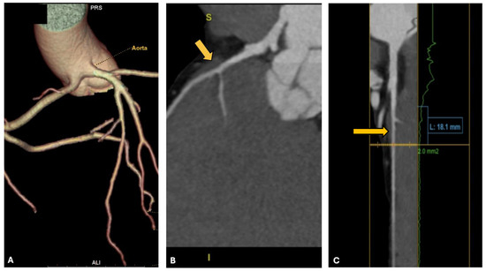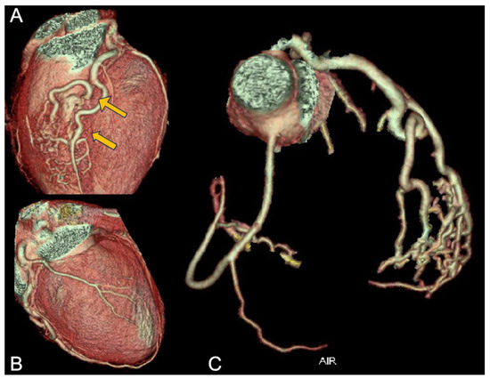 CCTA of the patient from case 5. In panel (A), the common origin of the right and left coronary arteries from the left Valsalva sinus is shown; in panels (B,C), the yellow arrows indicate the presence of the intramyocardial bridge on the LAD.