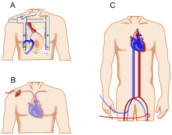 Illustrations of cannulation strategies for cardiopulmonary bypass, including central cannulation (A), right axillary arterial cannulation (B), and femoral cannulation (C).