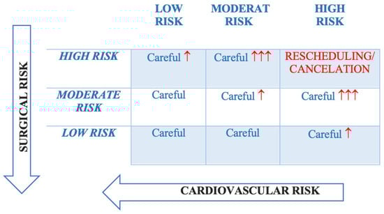 Total risk estimated by the interaction between the surgical risk and the patient’s cardiovascular risk. The red arrows signify the probability of perioperative cardiovascular complications (adapted according to the ESC 2022 guidelines).