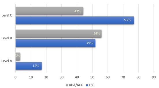 The cardiovascular risk associated with non-cardiac surgeries remains an unclear area, with insufficient studies. Current guidelines, although constantly updated, still contain gaps in evidence. This is supported by the fact that the ESC guidelines contain 53% level C recommendations (consensus of the experts and/or small studies, retrospective studies, registries), while only 12% are at evidence level A (data derived from multiple randomized clinical trials or meta-analyses), and 35% at evidence level B (data derived from a single randomized clinical trial or large non-randomized studies). In the AHA/ACC guidelines, the recommendations at level A are much lower, at 3%, while the level B evidence, based on one or more randomized or non-randomized studies (75% are non-randomized), accounts for 54%. Level C evidence, based on limited data or consensus of expert opinion, totaled 43%. The CCS guidelines are based on recommendations with 48% low-quality evidence, 36% moderate-quality evidence, and 16% high-quality evidence (Figure 3). From this analysis, it appears that the guidelines’ recommendations are less evidence based and more experts’ opinion. A more precise instrument for calculating perioperative risk is necessary, one that can encompass all aspects related to both the patient and the surgical intervention. The measurement of preoperative cardiac biomarkers is a first step for the prevention of cardiovascular events, but it is still insufficiently applied. Echocardiography should be performed on all patients with high cardiovascular risk over the age of 45 for the early diagnosis of heart failure with preserved ejection fraction or CCD.