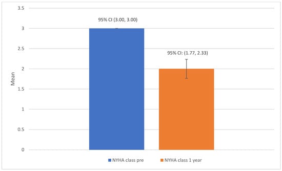 The clinical measures at baseline versus one-year post-insertion of the Cordella device are shown in Table 2. In total, there were 26 admissions for HF decompensation across the group of 33 patients in the one-year pre-device insertion, and only 3 admissions were recorded for the same group in the one-year post-device insertion. The mean number of HF hospitalisations per patient one year pre- and post-device insertion was 0.79 (+/−0.86) and 0.09 (+/−0.29), respectively (p < 0.0001) (Figure 1). The difference in mean NYHA class score pre- and one-year post-implantable PAP monitor insertion was 1.0 (p < 0.001) (Figure 2). The mean 6 min walk test distance (6MWT) (metres) pre- and one-year post-device insertion was 259.56 (+/−170.81) and 291.04 (+/−128.52) metres, respectively (p = 0.327). The mean NT-proBNP level at baseline and one-year post-device insertion was 2138 ng/L (+/−2342) versus 2220 (+/−2782), with these values both skewed significantly by outlier values (p = 0.337). The mean baseline PA pressure, as measured by right heart catheterisation at the time of Cordella implant, was 28.79 mmHg (+/−12), and the mean PA pressure as measured by the Cordella device at 12 months post-insertion was 29.30 mmHg (+/−11). There was no statistically significant difference in PA pressures at one-year post-device insertion compared to baseline (p = 0.735). The mean overall summary KCCQ score pre-device insertion was 62.61 versus a mean score of 65.49 1-year post-device insertion (p = 0.427).