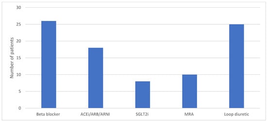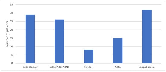 Baseline use of loop diuretics and HF GDMT are illustrated in Figure 3. A significant proportion of patients were on a beta-blocker (n = 29/33), ACEi/ARB/ARNI (n = 26/33), and diuretic (n = 32/33) at the time of PAP monitor insertion. The use of SGLT2i (n = 8/33) and MRA (n = 15/33) was modest in comparison. The proportion of patients on these classes of medications at 12 months is outlined in Figure 4.