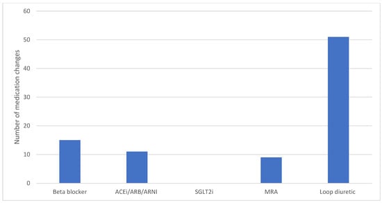 The changes in the use of diuretics and HF GDMT over the 12-month period following insertion of the PAP monitor were analysed (Figure 5). In total, 111 changes for 33 patients over the 12-month period were performed. Loop diuretics were the most commonly changed medication class, with 51 changes made in total over this period.