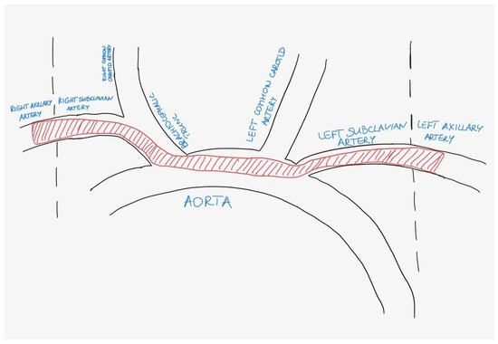 Figure 2. Scheme of the embolism (red colour) of the aortic arch and its branches.