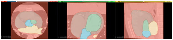 Supervised images for the segmentation were created using a 3D slicer [16], which is a free open-source software for the visualization, processing, segmentation, registration, and analysis of medical, biomedical, and other 3D images and meshes. The supervised images were created through a comprehensive review process involving three radiological technologists with 25, 15, and 7 years of experience in cardiac imaging. Each technologist independently reviewed and labeled the images, manually delineating the relevant cardiac structures, including the left ventricle, left atrium, aorta, and aortic valve annulus region. Any discrepancies in labeling were discussed and resolved through consensus among the technologists. This multi-reviewer approach was chosen to ensure the accuracy and reliability of the labels, leveraging both the extensive experience of senior radiologists and the potentially fresh perspectives of more junior colleagues. Supervised images were manually labeled in axial, coronal, and sagittal orientations (Figure 1).