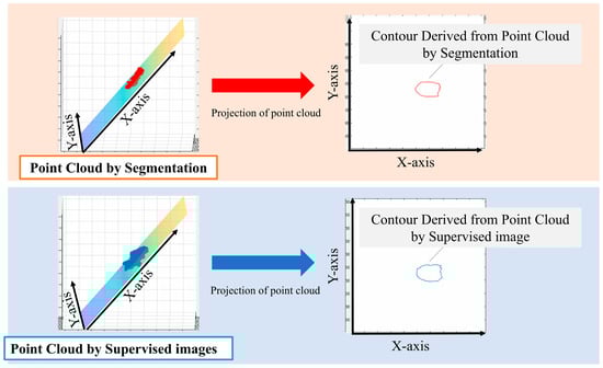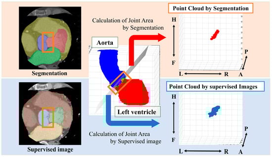 From the segmented results, a point cloud is obtained by displaying the boundary between the LV and Ao in 3D. In this study, we define a ’point cloud’ as a set of three-dimensional coordinates representing the boundary between the left ventricle and the aorta. These points collectively form a discrete representation of the aortic valve annulus region. The point cloud is derived from either the segmentation results or the object detection outputs, depending on the method used. The point cloud is then obtained from the supervised image in the same way (Figure 2).