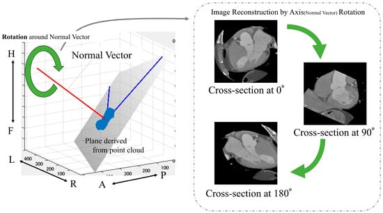 The following is a summary of the image preprocessing used in the analysis. First, a point cloud was extracted from the boundary between the left ventricle and aorta from the segmentation results (Figure 2). Then, principal component analysis was performed on the point cloud data to calculate the optimal plane. The normal vector was obtained from the calculated plane and drawn from the center of gravity. We calculated the center of gravity of the point cloud representing the boundary between the left ventricle and aorta. Using the normal vector passing through this center of gravity as the rotation axis, we reconstructed sections rotated from 1° to 180° (Figure 4).