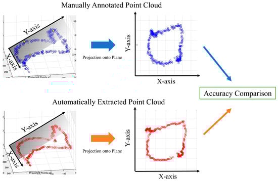 The point cloud data displayed on a three-dimensional plane was subjected to principal component analysis to obtain the optimal plane for the point cloud data. All the point clouds on the 3D plane were projected onto the obtained plane, and the periphery of the projected point clouds on the 2D plane was assumed to be the aortic valve. We then evaluated the accuracy of the aortic valve annulus area estimation for both the manual and automatic methods. This evaluation process is detailed in the following sections and illustrated in Figure 7. Since the outer circumference of the point cloud calculated from the results in Figure 7 was assumed to be the aortic valve, the accuracy was evaluated using the DSC to see how well the aortic valve annulus area calculated from the object detection results matched the aortic valve area calculated from the supervised image.